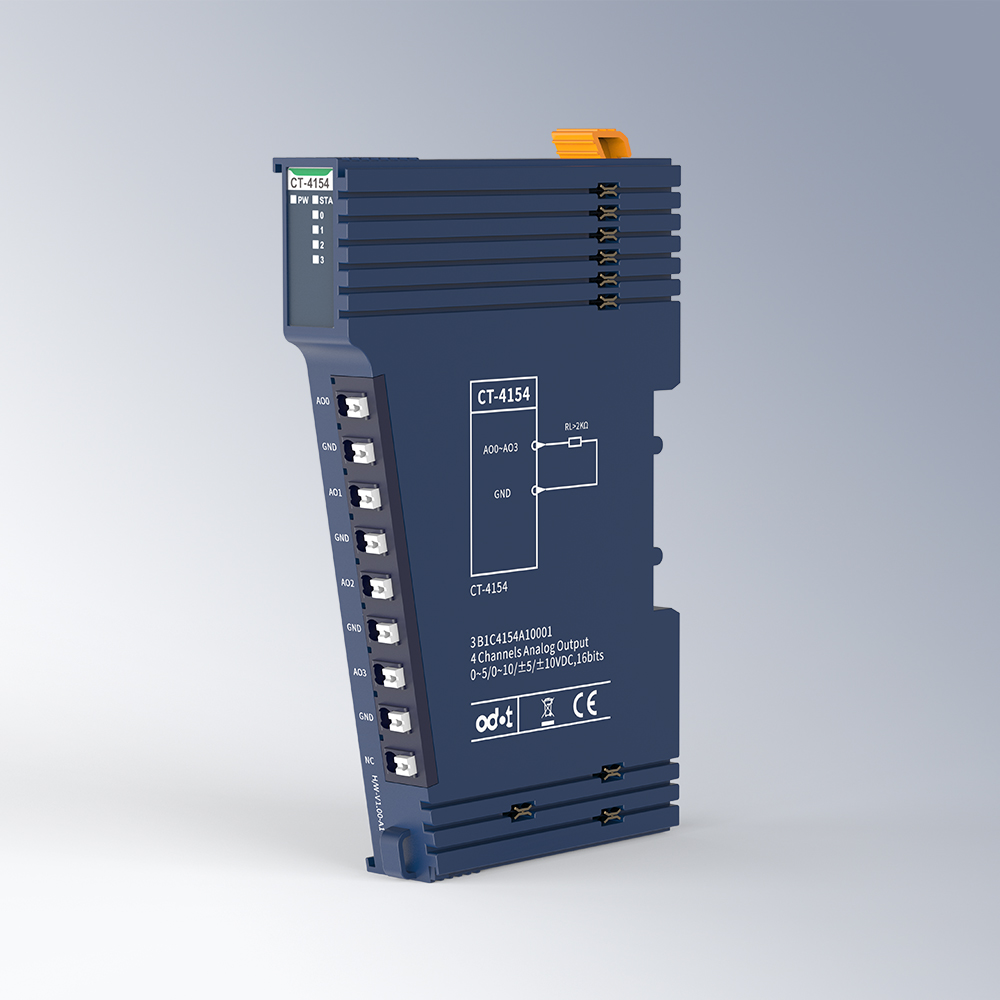 4-channel voltage output: 0–5V, 0–10V, ±5V, ±10V.