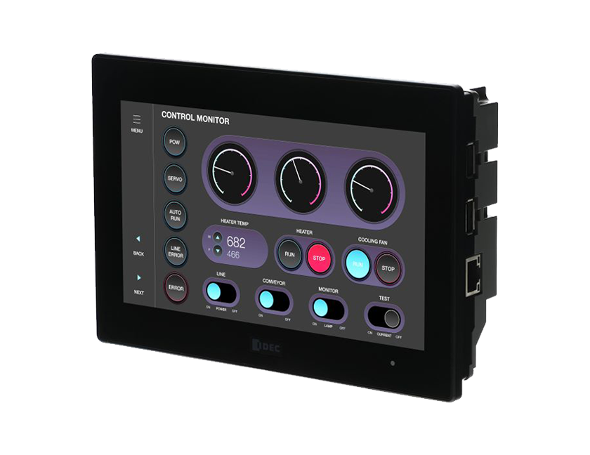 Compact 7” PLC+HMI with 22 I/O (14 in, 8 out).
